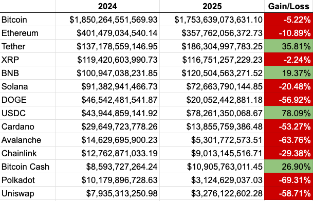 Many speculative meme coins, utility coins and store of value coins saw significant market cap losses in 2025.