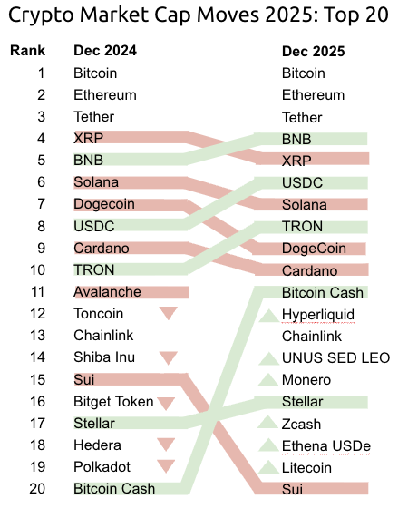 - 🔗 Crypto is bifurcating: speculation down, utility up: Meme, and volatile “store of value” coins broadly lost ground in 2025, while assets tied to transaction flow (USDC, Tether, BNB, Bitcoin Cash) gained—signaling investor preference for rails, cash equivalents, and real usage over narratives.