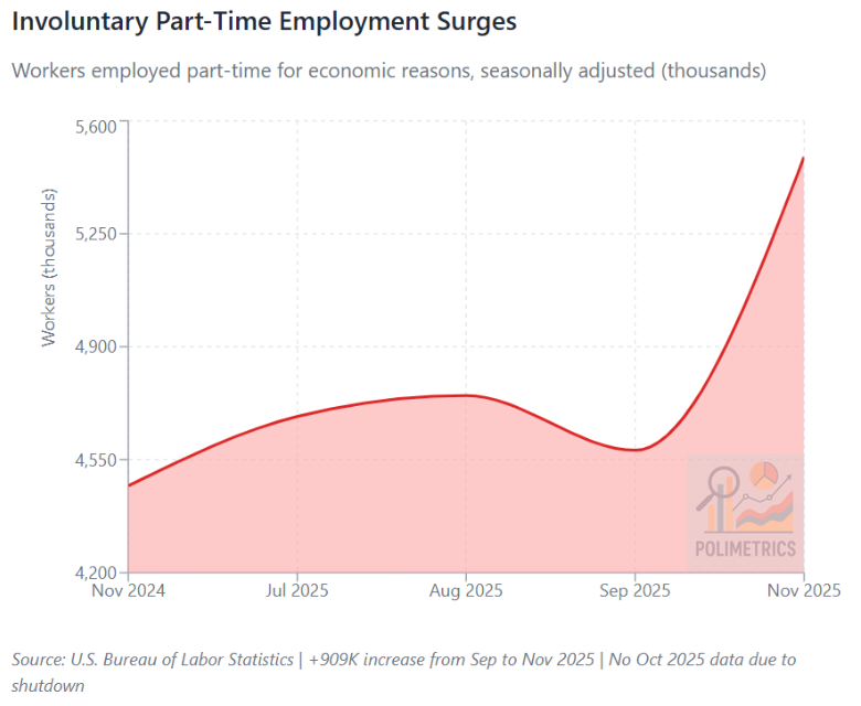 - 📊 Fiscal and labor signals stayed stressed: Government tax and spending both rose, inflation remained above target, layoffs quietly accumulated, involuntary part-time work surged, and tariffs proved insufficient to meaningfully replace income tax revenue.