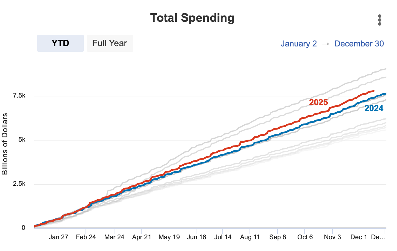 Total government spending also rose noticeably, in spite of the DOGE activities in early 2025.