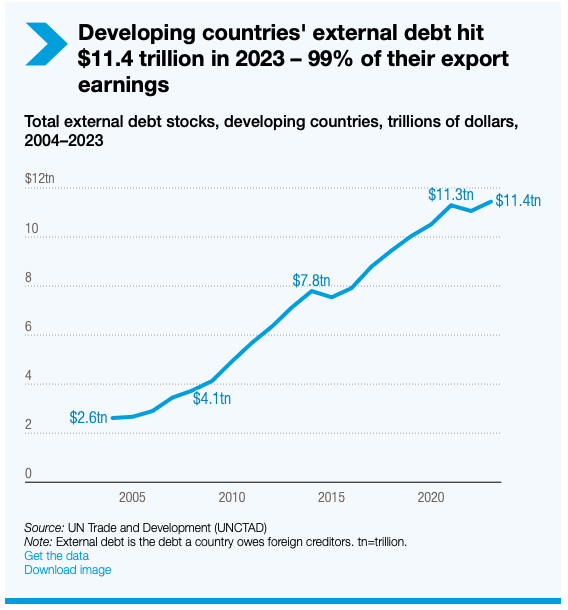 Developing countries around the world are struggling under crushing loads of debt - that require them to spend more and more of their GDP on servicing their debt instead of taking care of their own domestic needs. External debt for developing countries hit a new record in March 2025.