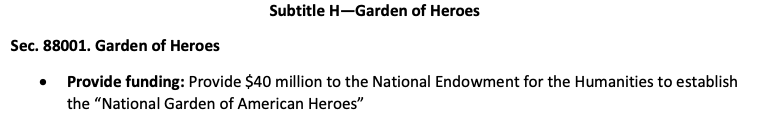 While it tightens funding for education and healthcare, it also splurges on odd items such as a $40 million “National Garden of American Heroes” (you can find this on page 3 Subtitle H here: https://www.help.senate.gov/imo/media/doc/help_committee_reconciliation_2025_section-by-section.pdf)