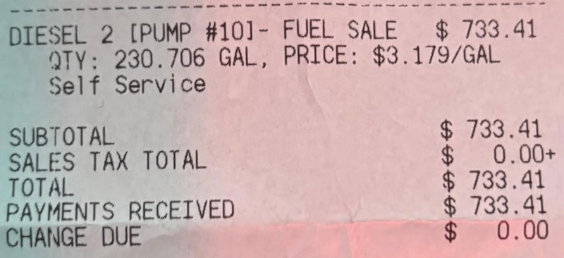 "Posting this so we can compare next year" said one excited friend in December 2024, at that time still thrilled about the outcome of the 2024 election. It was a gas receipt (anonymized excerpt below) showing the cost to gas up a semi-truck at the then rate of $3.18 per gallon.