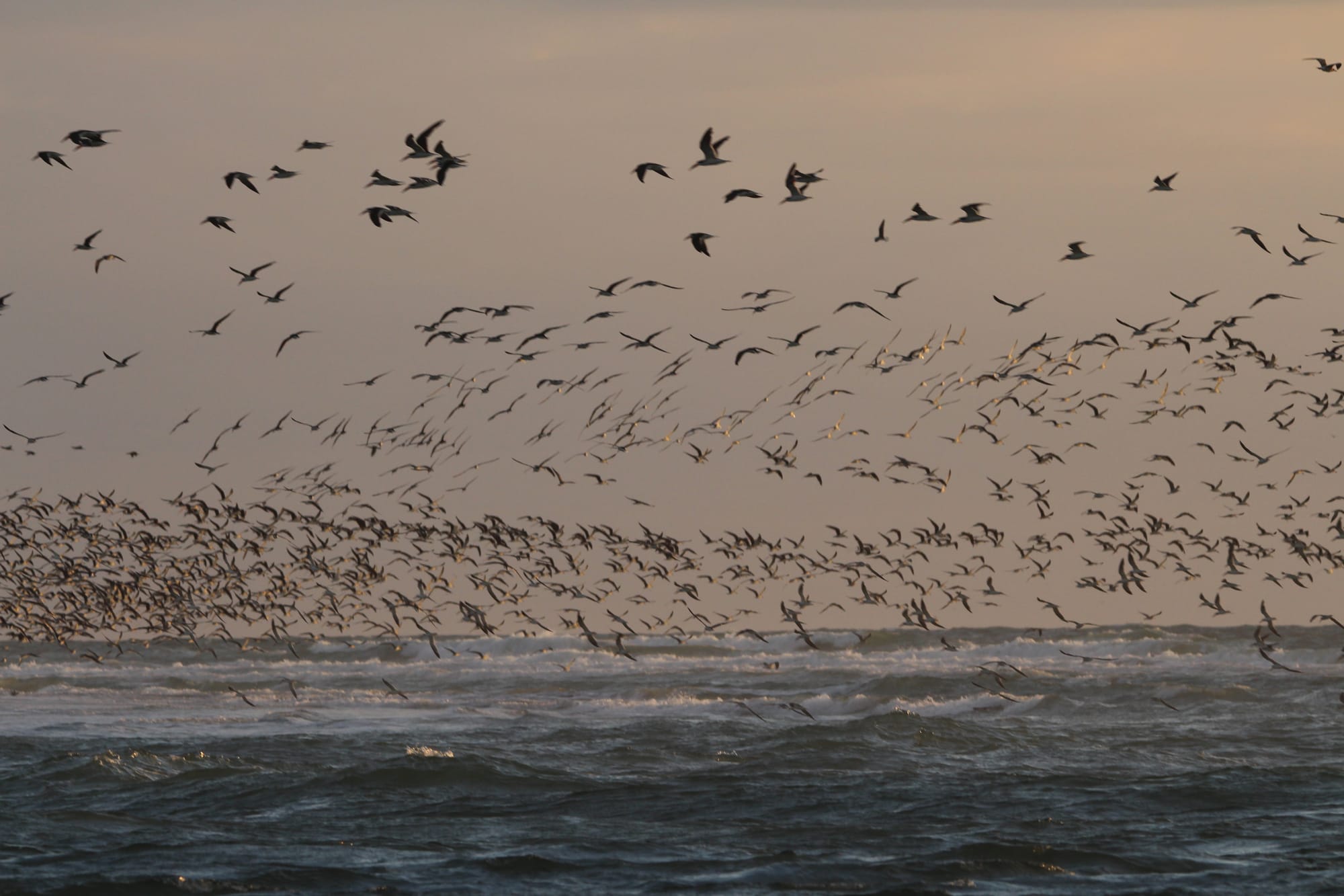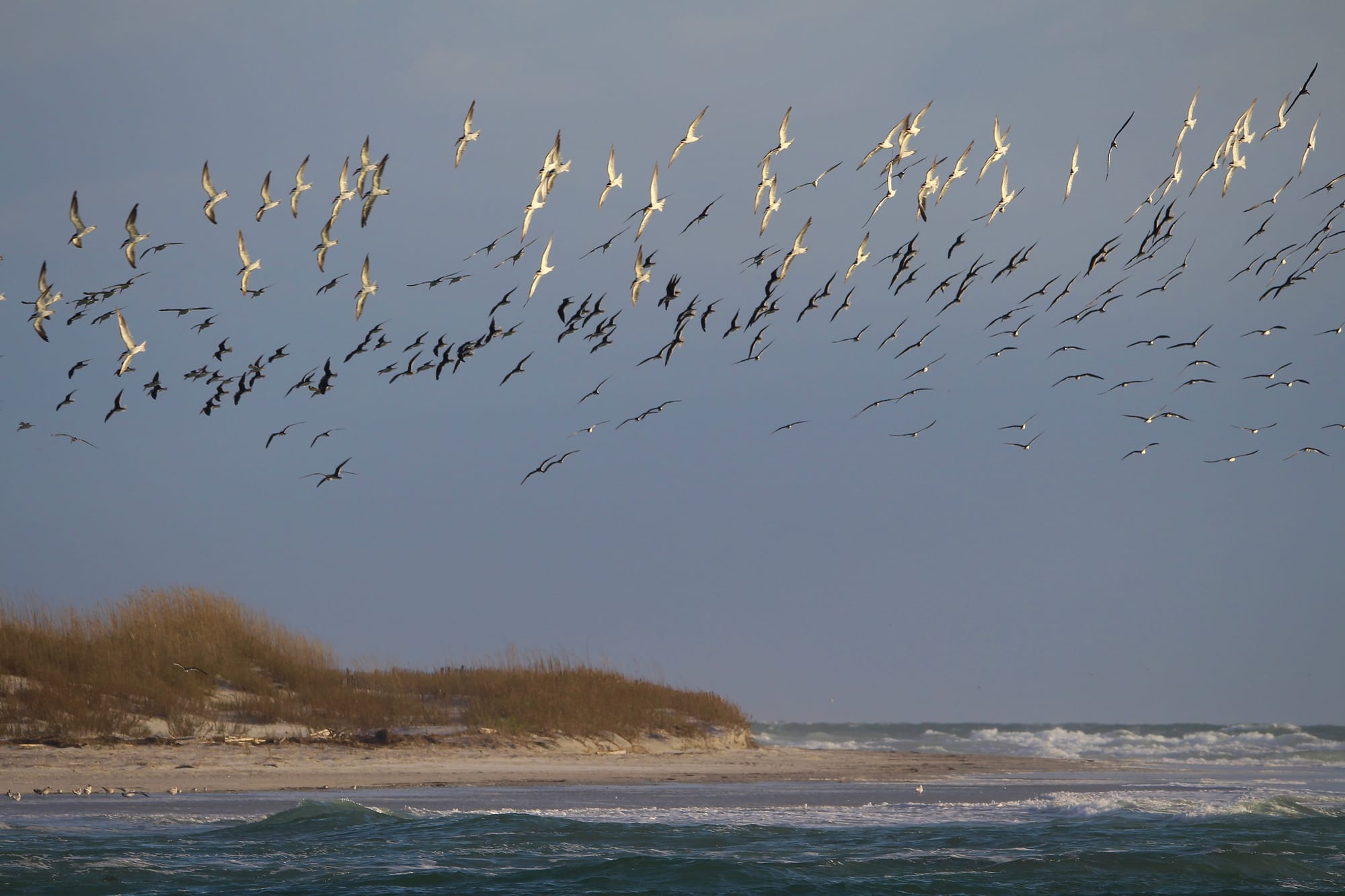 The large gathering of Skimmers I observed seemed to be feeding. There were at least 3 large groups of perhaps a thousand each, moving up and down an inlet between two barrier islands. They would suddenly swoop down and skim just above the water using their oddly shaped beaks (with lower mandible longer than the upper) to snag fish. Then just as suddenly the entire flock would lift off the water surface and move in a group up into the sky, always eyeing the water. At the same time one or two other large groups might be skimming the surface or moving back up to higher elevation ready for the next feeding run.