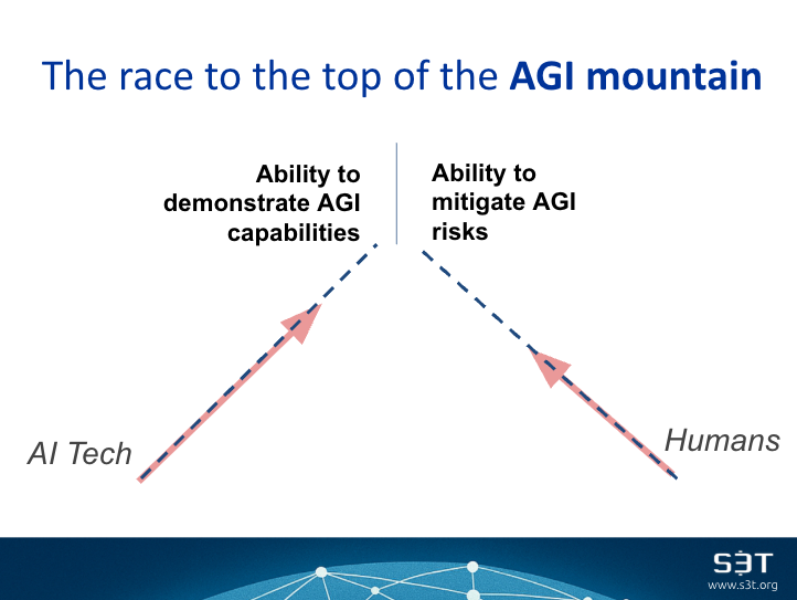 What follows are a series of slides from a recent talk I gave on AGI. You can think about AGI as a race between humans and technology: