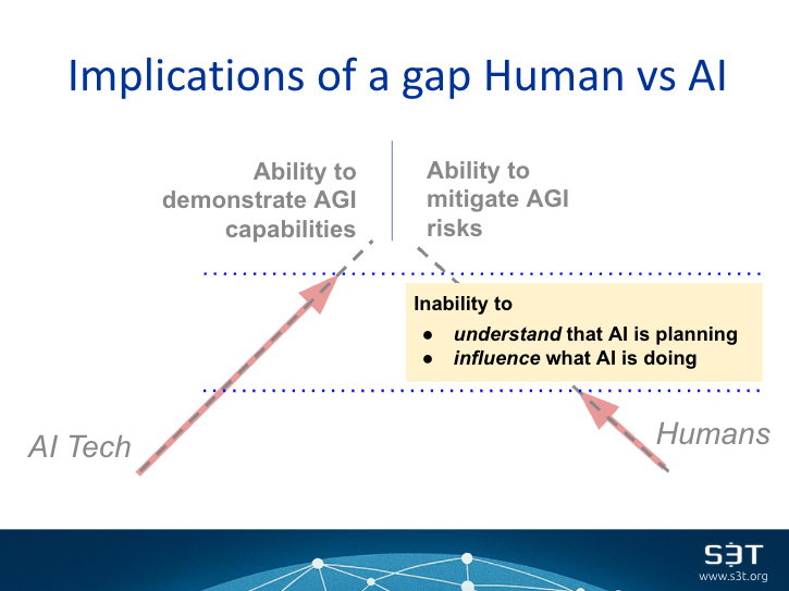 A dangerous scenario - where AI technology races ahead of humans - would manifest itself as an inability of humans to understand what an AI entity is doing or planning, and an inability to exercise any meaningful influence or control over that AI entity.