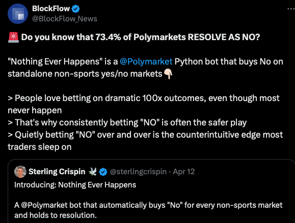 The bot was developed by former Apple researcher Sterling Crispin after noticing that 73.4% of Polymarket non-sports predictions always resolve to NO!