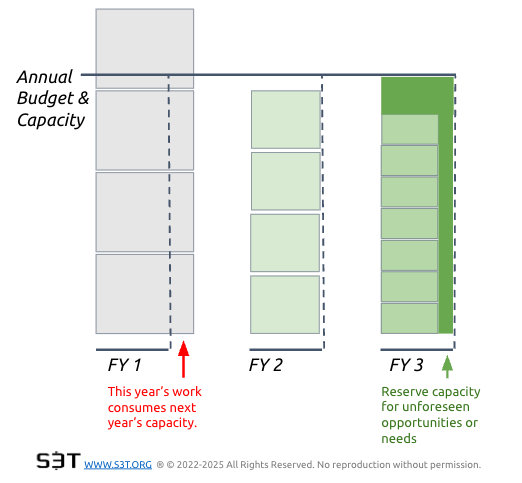 The above graphic shows the implications of incorrectly sized work. FY 1 represents a company that takes on fewer initiatives than they could/should simply because their workforce lacks the talent to size and execute the work. It is perceived to be larger than it actually is.