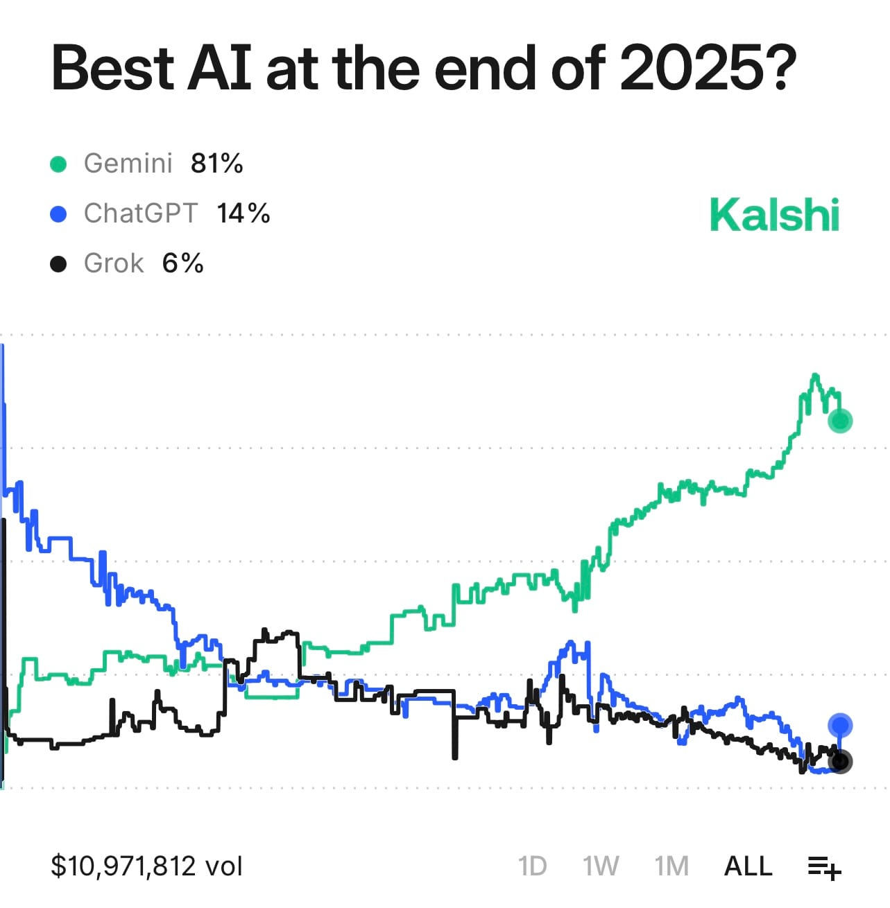 I've noticed this trend for better part of this year: Gemini getting better and better compared to ChatGPT. Now I know it is not just me. And it's not just Futures markets like Kalshi (graphic from this week, above).