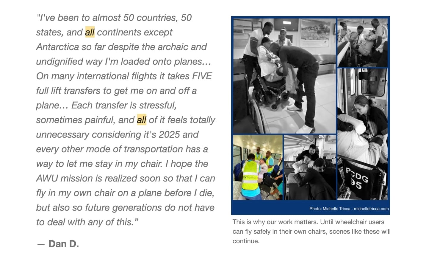 Finally S3T Member Dan Dorszynski is continuing advocacy for airlines to change their wheelchair policy. Dan was recently featured in All Wheels Up: