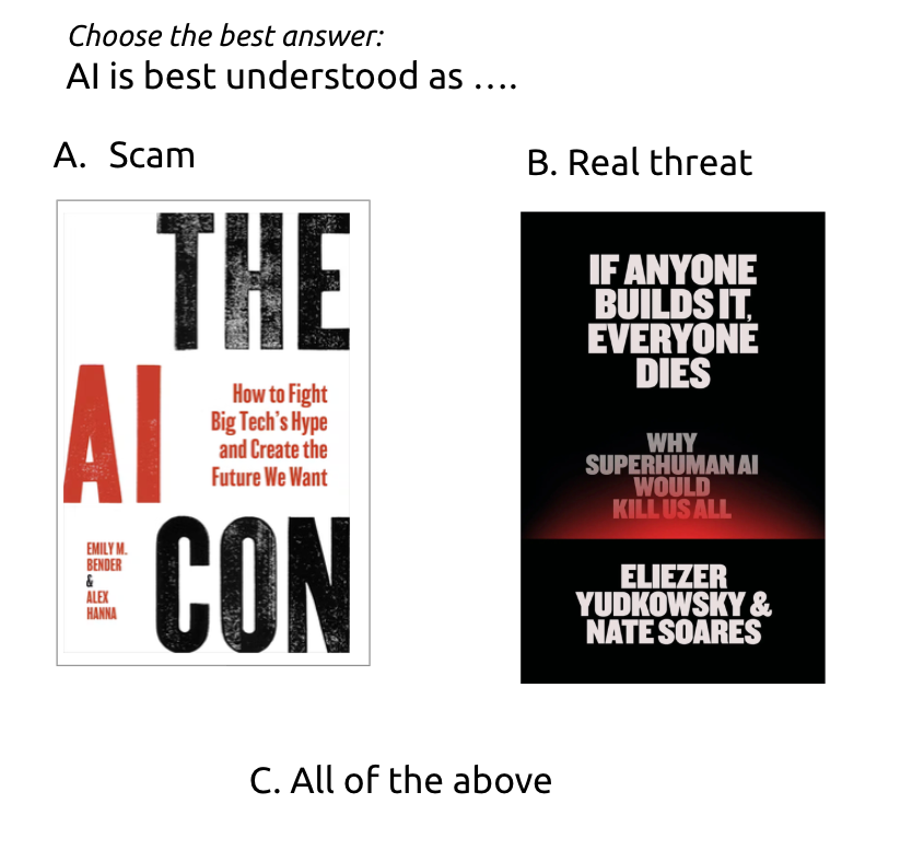 - 🤖 AI Polarization Intensifies — The 2025 debate over AI now spans from “colossal scam” claims (Bender) to apocalyptic threat warnings (Yudkowsky), reflecting deep divides over AI’s real value and existential risks.