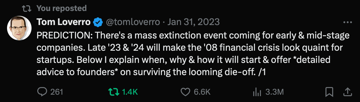 Back in Jan 2023, I shared an outlook on the "capital crunch" as the era of easy money began to close. Around the same time Tom Loverro's predicted a "mass extinction event" coming to the startup world: