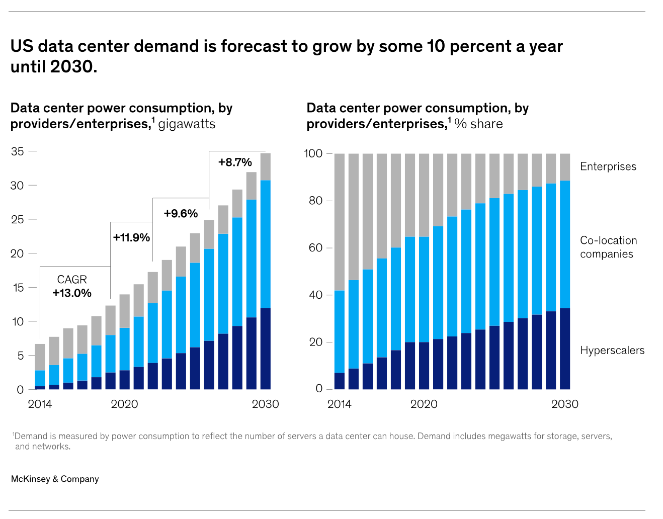 Nvidia's higher than expected earnings news sparked new AI FOMO and market hype - as well as expectations of a pullback. AI initiatives are driving demand for a new generation of AI chips, along with expected data center growth, as noted recently by McKinsey (see below).