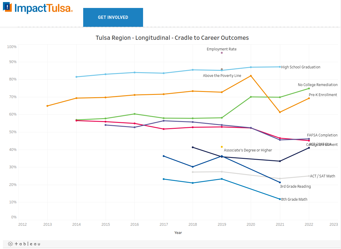 As shown below, the dashboard shares continuously updated indicators on how the Coalition partners are improving what they call the "Cradle to Career Outcomes" of the Tulsa Region.