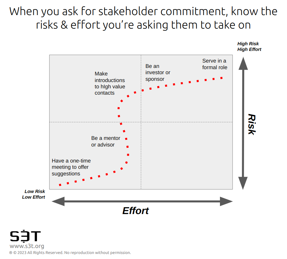 When you ask for the involvement and commitment of a stakeholder, it helps for you to be aware of what they may already be involved in, what responsibilities they carry, and what constraints they may have. You also want to have an awareness of the level of effort and level of risk you may be asking them to take on. Typically it is better to start small - asking for small commitments or steps, that allow you to get acquainted and build trust. Then proceed to higher levels of commitment from there.