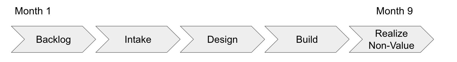 Initiatives flowed through sequential gates for funding, architecture, security, testing, and operational readiness. Each gate was staffed by specialists who expected work to arrive in a steady, first-in/first-out queue, and were empowered to create backlogs extending months or even years whenever demand exceeded capacity.